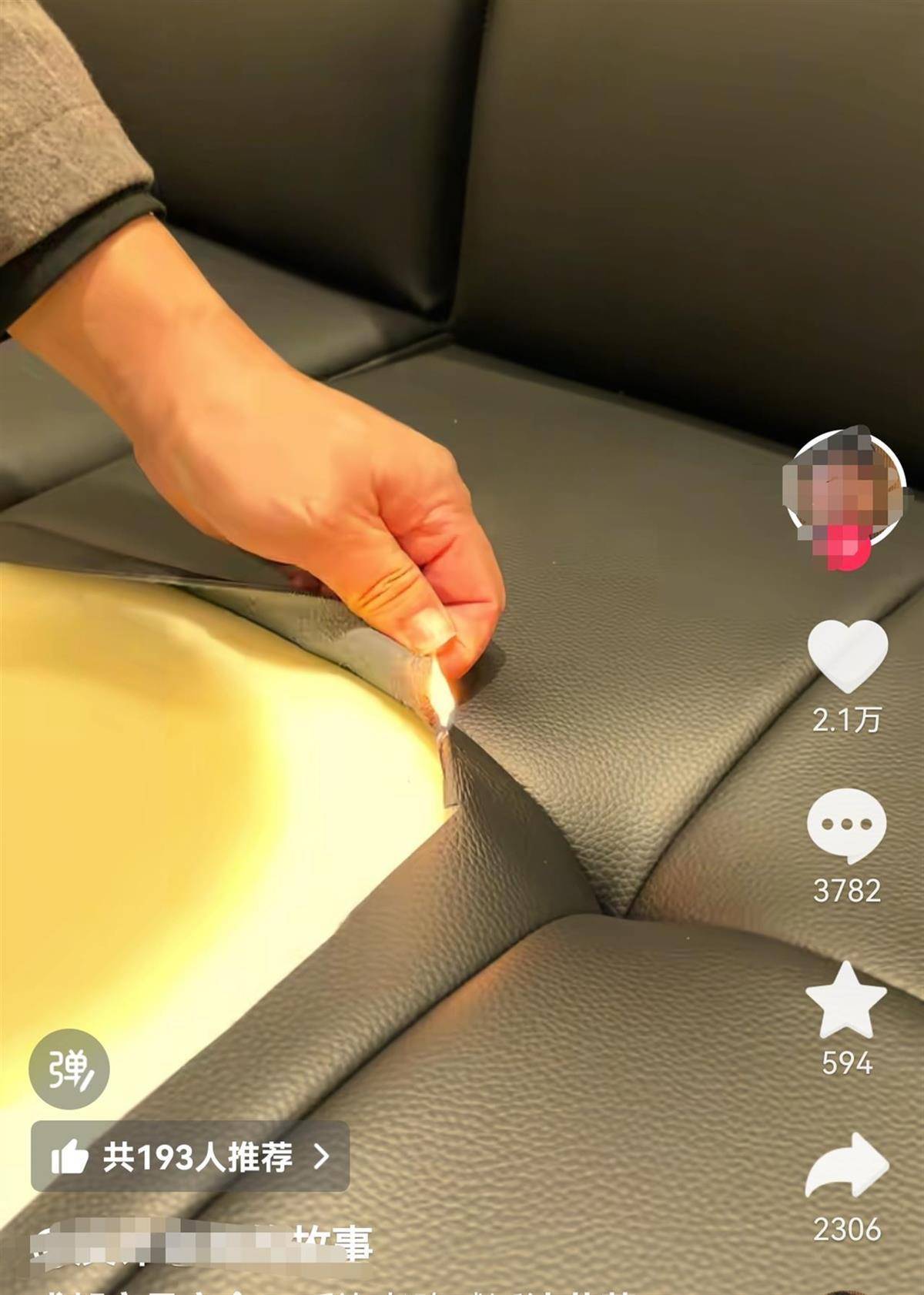 视频中,“反诈老陈”与成都家具商会的工作人员共同出镜,他们称身旁的床和沙发在直播间被宣称是头层牛皮,而实际收到的货并不是真皮,经权威机构检测是人造革。他们还用打火机点燃了从沙发、床头取下的皮革,“一点就燃烧了,显然这不是真皮,也不是头层牛皮,而是人造革。”